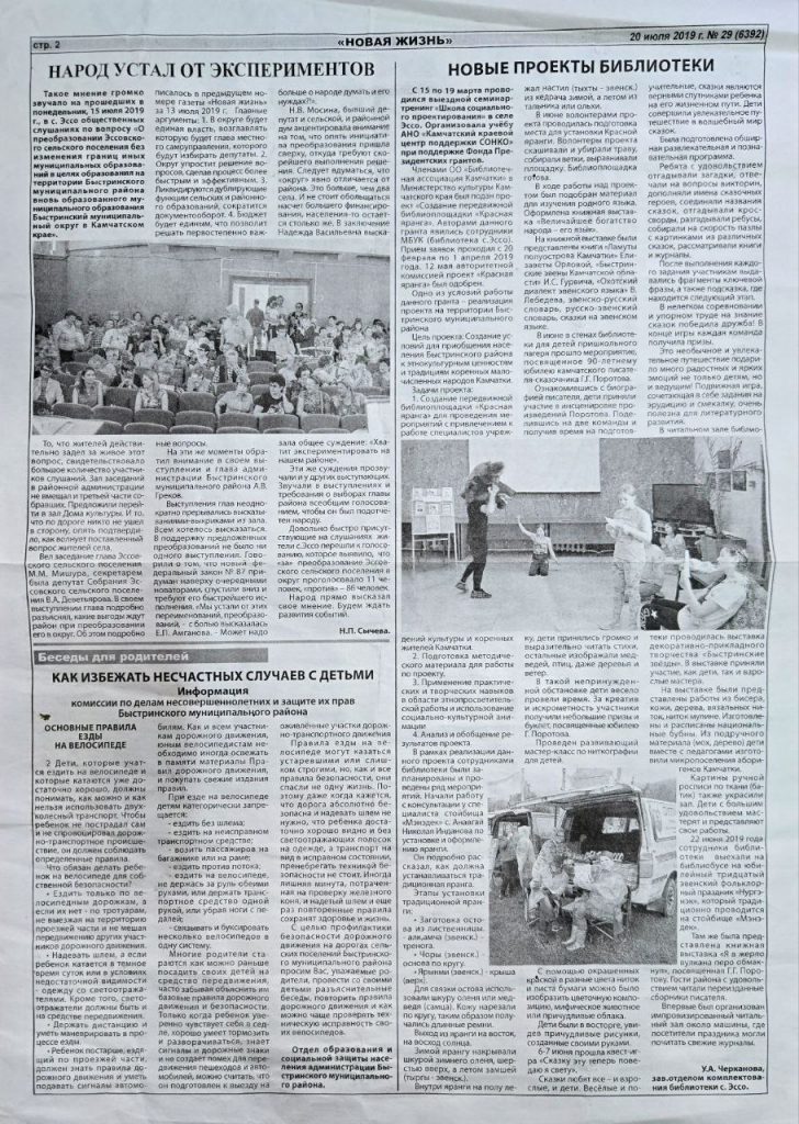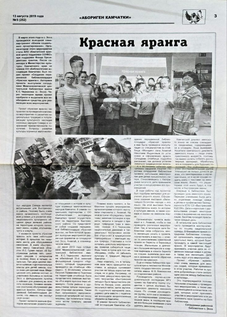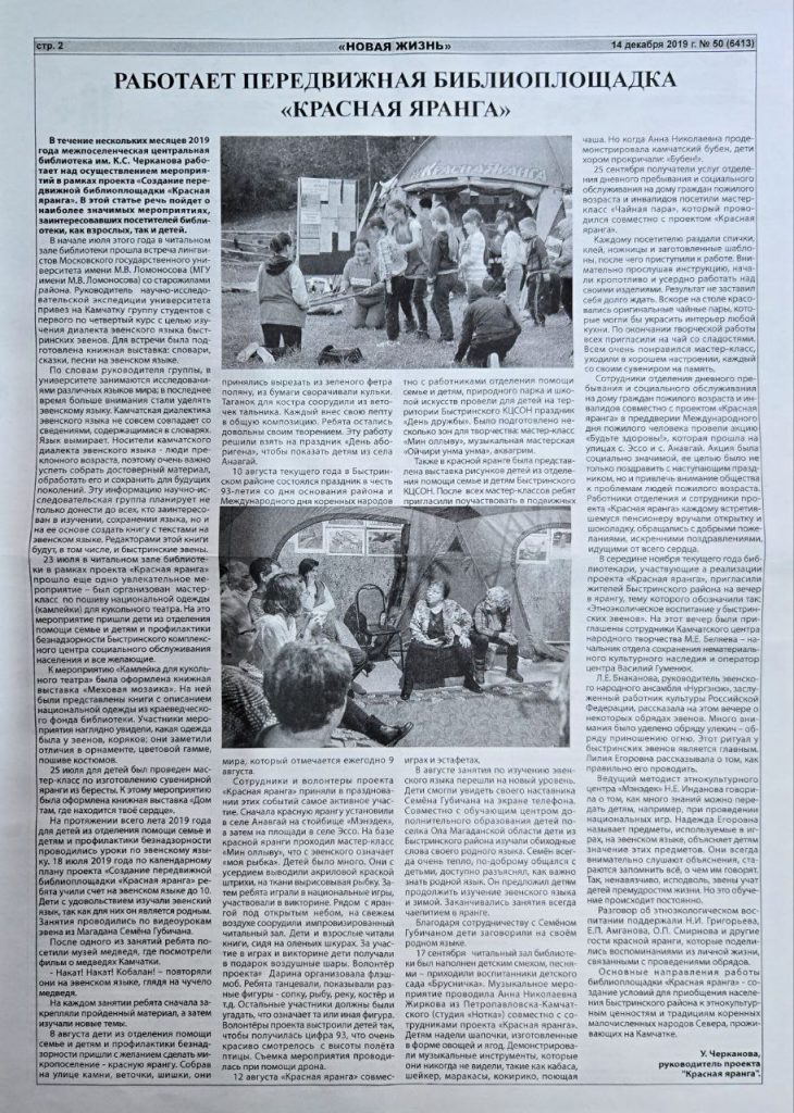 В этом году проект библиотеки с.Эссо «Создание передвижной библиоплощадки «Красная яранга» отмечает свой семилетний юбилей. Мы с гордостью предлагаем вам вспомнить проделанный нами путь и важные моменты развития проекта, нашедшие свое отражение на страницах местной газеты «Новая жизнь». Это лишь малая часть той огромной,интересной и нужной работы проведенной как на территории Быстринского района, так и на территориях других муниципальных образований Камчатского края. Мы благодарны всем, кто был и остается с нами на протяжении всех этих лет! Спасибо, что вы с нами!
